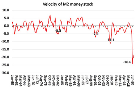 But has this money disappeared then? No, it is still there, but the money injections by the Federal Reserve and other central banks - mainly achieved by ‘printing money’ and purchasing huge quantities of government and corporate bonds, as well as making loans and grants - have ended up, on the whole, not in the hands of businesses and households to spend, but in the deposits of banks and other financial institutions. This money has been hoarded or used to fund speculation in financial assets (a booming stock market and investment in hedge funds, etc). So the velocity of money (V) in goods and services transactions has plummeted.