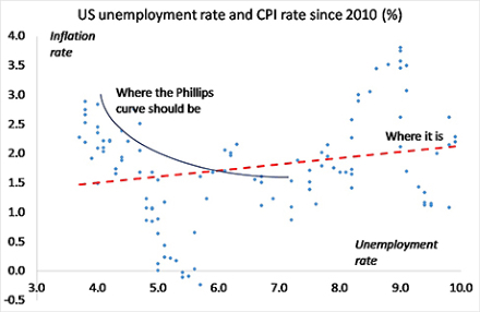 Fig 2, based on monthly data, shows where the Keynesian Phillips curve should be if it works; and the broken line is where it actually is. Indeed, that line shows that falling unemployment leads to slowing inflation, at least since 2010!